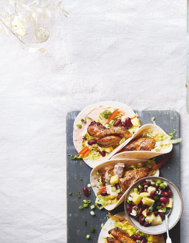 Jerk chicken wraps with bean salsa and hot sauce mayo