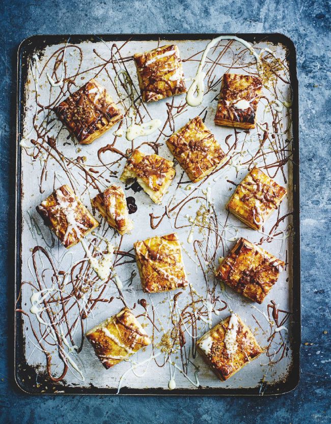 1 Heat the oven to 200°C/180°C fan/ gas 6. Unroll the pastry onto a work surface. Using a rolling pin, gently roll it out to the thickness of a £1 coin. Cut the pastry in half, widthways, then break the chocolate into its individual pieces and distribute evenly over 1 piece of pastry, leaving a 1cm gap between each piece of chocolate and at the edges.