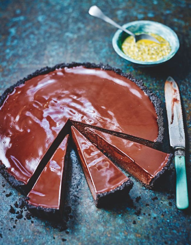 Chocolate mousse and passion fruit tart
