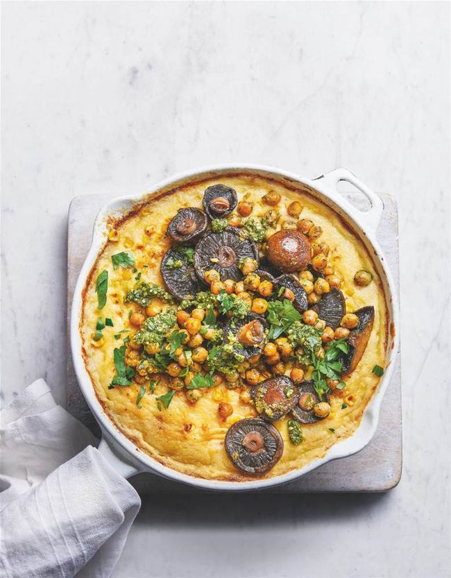 Cheesy baked polenta with garlic butter mushrooms & chickpeas