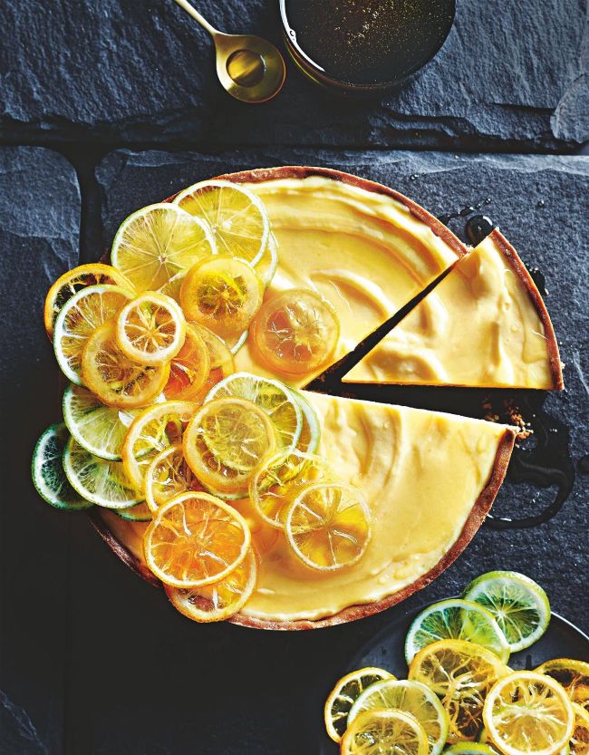 Soft, sweet-sharp curd, nutty crumbly pastry and sticky citrus segments, all flavoured with the refreshing sharpness of juniper – and gin. Cheers!