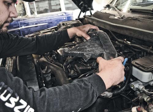 Brown’s Diesel technician Gustavo “Goose” Quezada started by removing the engine cover on our stock, highmileage engine.