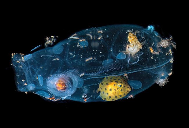 Anight-time dive encounter with a magical 5cm transparent tunicate in Indonesia’s Lembeh Strait. This mysterious sea creature is so transparent that it’s almost invisible. Both filled by and covered in other types of marine life, the tunicate is like a miniature diverse ecosystem, floating through the night sea.