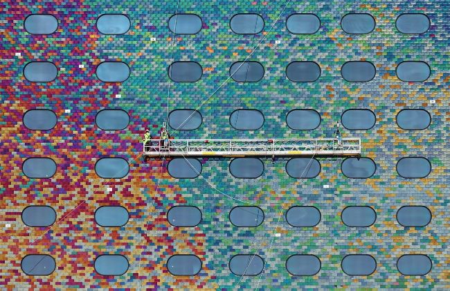 “These artisans are hand-placing 144,000 acid-washed tiles to the stunning exterior of the Universal Stella Nova Resort hotel in Orlando, Florida, USA. The tiles were designed by the Universal Creative team and the Universal Stella Nova Resort opened in January 2025.” flickr: shannonroseoshea