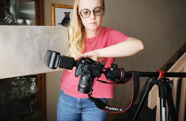 Placing my camera on a tripod, I used the central column to extend the camera over the food. I lit the scene with an external flash and experimented with settings. After starting at 1/80 sec at f/8, ISO 100, I slowed the shutter speed to 1/160 sec to get a darker image. One thing I found useful was to employ a metal baking tray as a reflector to bounce light in.