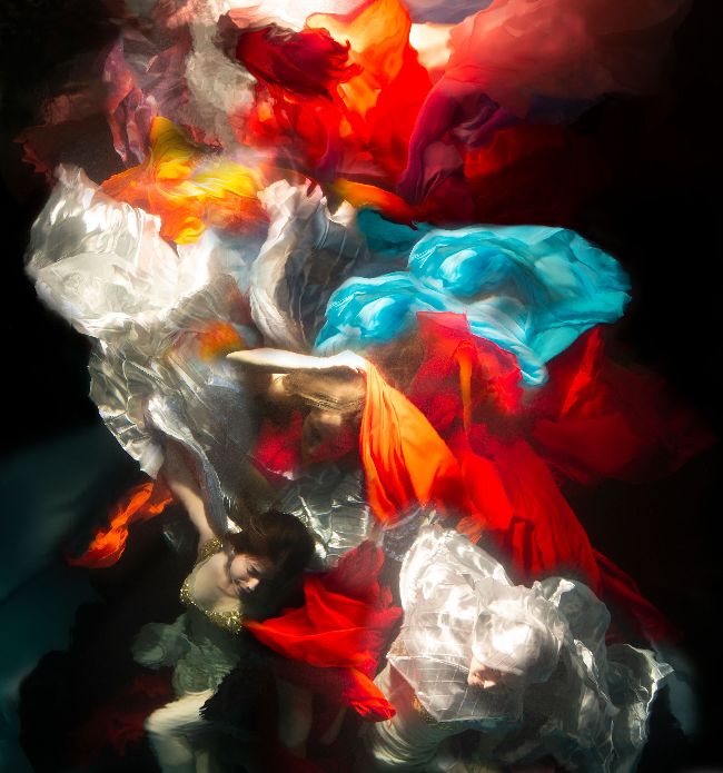 A signature Christy image features a group of female models floating just underneath the surface of water. Clothed in flowing dresses or wrapped in fabrics, Christy’s subjects float in a dreamlike world, where the texture of richly coloured billowing fabrics comes to life via a delicate use of refracted light – an effect that magically highlights and lifts the models from the shimmering or rippled water.