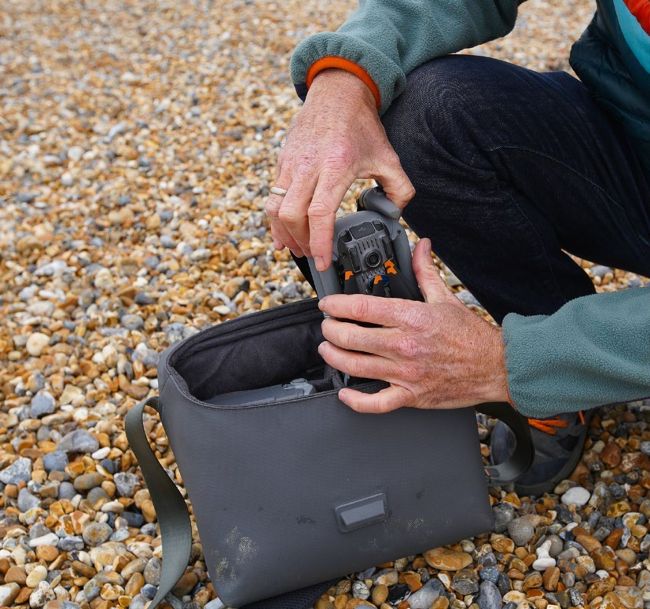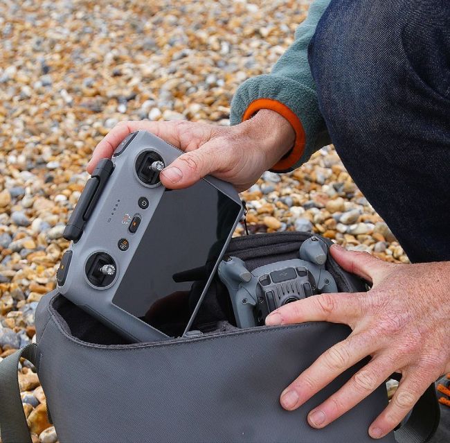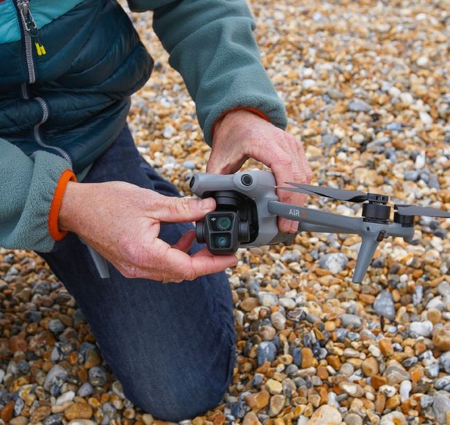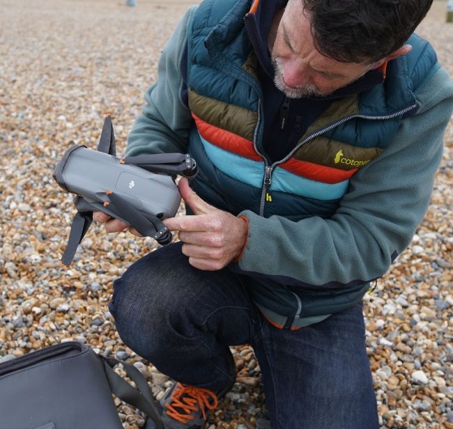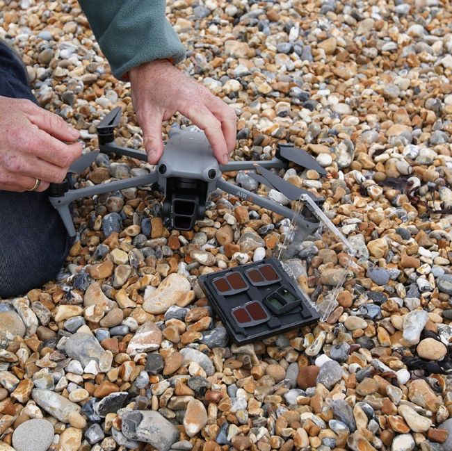 Clockwise from top left: the RC controller and DJI Air 3 stow in a small bag. Unfolding the drone and extending its propellers. Fitting the battery – Kennedy always carries spares. Preparing to fit clip-on dual ND filters, essential for filming video. Strengths range from ND8/16 to ND64/128.