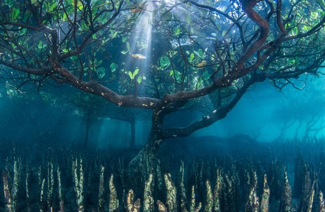 WINNER: Plants and Planet ‘Mangrove Tree (From Underwater)’ Leena Roy Location: Bunaken National Marine Park, Sulawesi Island, Indonesia “A mangrove tree surrounded by numerous roots on the seabed, which I photographed from under the water, looking up. Mangrove forests not only act as carbon banks but they also stabilise the coastline from storms and erosion, as well as being a vital habitat for fish, crustaceans and hunters like sea snakes. The leaves of the tree are underwater at high tide and, above water, their canopies are home to many birds and mammals.”