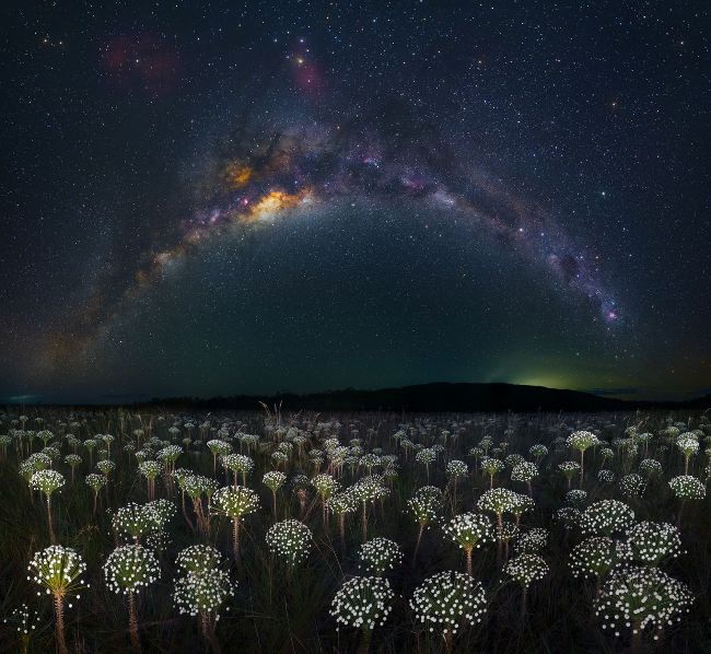 This panoramic image of a blooming field of Paepalanthus wildflowers under the Milky Way arch was taken in Chapada dos Veadeiros, Brazil. The stunning scene was created by stitching together eight images – four of the stars and four of the flowers, which were illuminated by lanterns to create a magical effect.