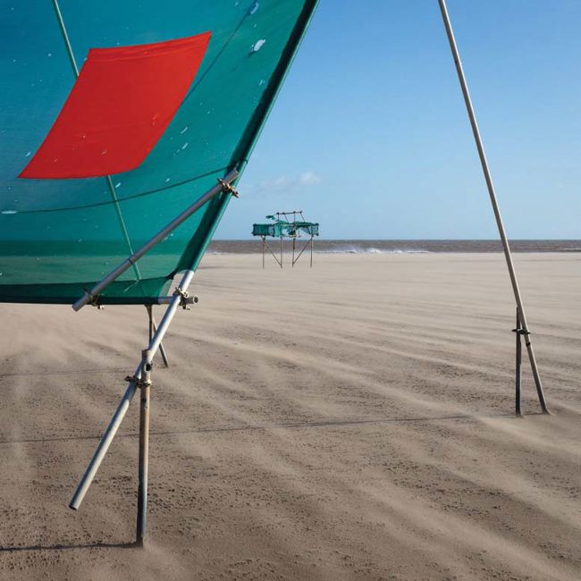 With scaffolding structures that resemble Middle Eastern pick-up trucks, the tidal aerial bombardment range at Donna Nook looks like a scene from Mad Max. The red rectangle is so arresting graphically, while the scaffolding subdivides the frame. The tubes’ bullet holes and the punctured targets hint at violence that often rains from above.