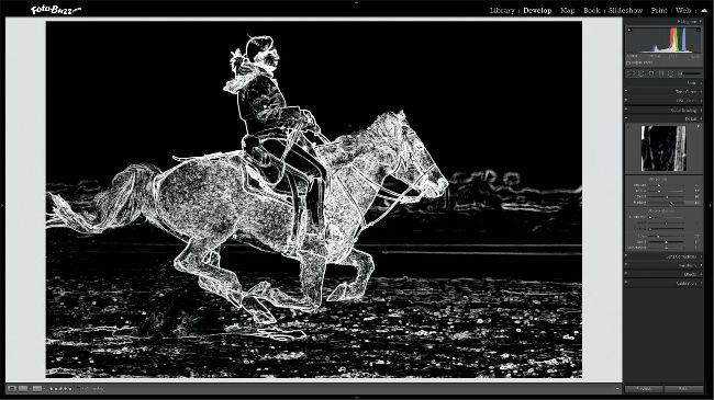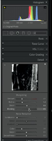 However, you can improve apparent sharpness within an image during editing, although I’d stress that you can’t make a blurry photo suddenly sharp by tweaking a few settings. All image processing software has a sharpening tool, which works by boosting the contrast on the hard edges of a subject or scene, as you can see above in Lightroom. The edge areas in white are the areas that get sharpened.