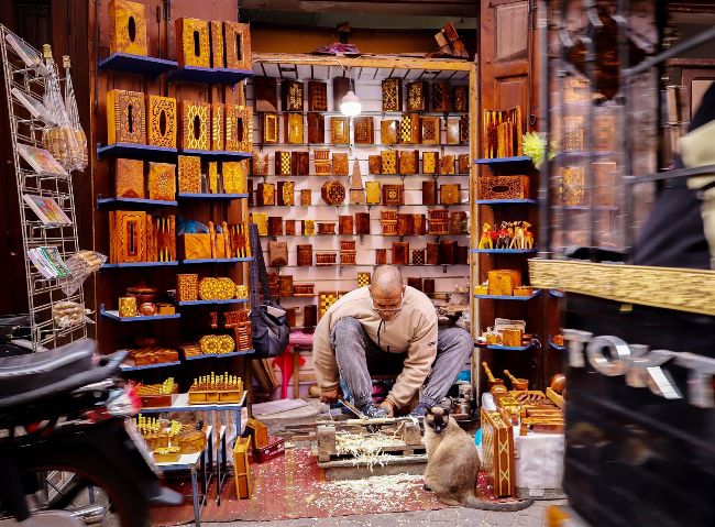 A stall owner perfecting his craft of making chess boards, tucked away off a bustling street.