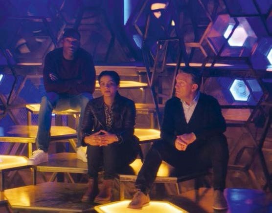 Ryan (Tosin Cole), Yaz (Mandip Gill) and Graham (Bradley Walsh) on the control room steps.