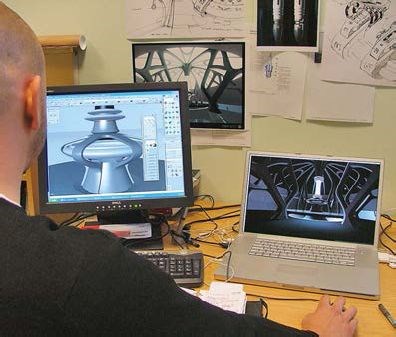 a sketch by Bryan Hitch; the console visualised by Matthew Savage; Dan Walker’s CGI render of the console (bottom); and a close-up of the finished console (far right), complete with ‘Gallifreyan’ stickies.
