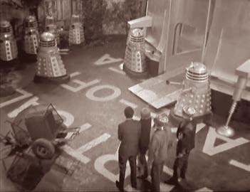 Far left below: Ian (William Russell) is taken to the flying saucer in The Daleks, the second episode of The Dalek Invasion of Earth (1964). In Terry Nation’s draft script, this scene originally appeared at the end of the first episode.