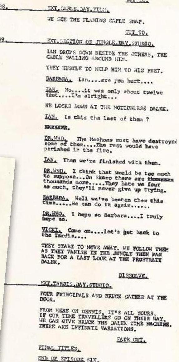 Once the Doctor Who story outline had been accepted, and the scene breakdown had been agreed (if one was required), the next stage was for the writer to be commissioned to deliver the script itself.