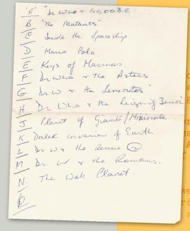 Above: This document, compiled by the Doctor Who production office in 1965, listed the titles of the first 13 stories.