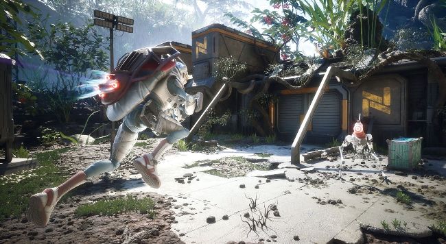Relinrake’s equipment gives him enhanced mobility, boosters flaring as we dash away from projectiles and soar into the air. This pairs nicely with snappy over-the-shoulder shooting mechanics, rewarding twitch reflexes with the satisfying sight of our robotic adversaries crumbling into a scrap heap. More intriguing, however, is the setting itself. “I always wanted to make something where you were small in nature,” McWilliams says. “I always liked insects and seeing [the world] from that scale.” We draw comparisons to games such as Grounded, which revels in the novelty of blowing familiar objects such as baseballs up to enormous proportions, but McWilliams stresses that the studio was keen to avoid the vibe of films such as Honey, I Shrunk The Kids. We don’t see any gargantuan children’s toys, then, as we journey to a militaristic structure more in line with the Far Cry series than The Borrowers, scanning the electromagnetic footprint of the base to track security cameras and sneak our way in.