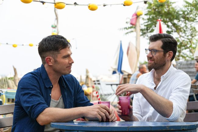 Is a meet cute a meet cute if the meeters cute don’t really meet (while being cute)? That’s the question posed in Bros, when Bobby and Aaron lock eyes across the crowded dance-floor of a gay club. “Luke is really fucking a camera,” laughs Stoller. We assume he means “with his eyes”. “He learned it during the Hallmark stuff. Billy’s good too. He’s good at making love with the camera. We went through so many cameras.” Which is cute.