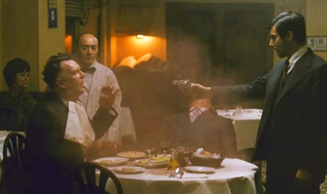 Michael walks over and sits down. Sollozzo starts speaking to him in Italian, but we aren’t told what he’s saying because Michael isn’t really paying attention either. The camera slowly pushes in on Michael as he steels himself for what he’s about to do.