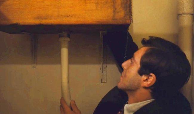 Michael Corleone (Al Pacino) emerges from the toilet, where he’s just retrieved the gun left for him behind the cistern. The gun intended for him to assassinate Sollozzo and McCluskey, the rival gangster and police chief responsible for the recent assassination attempt against his father, Don Vito Corleone.