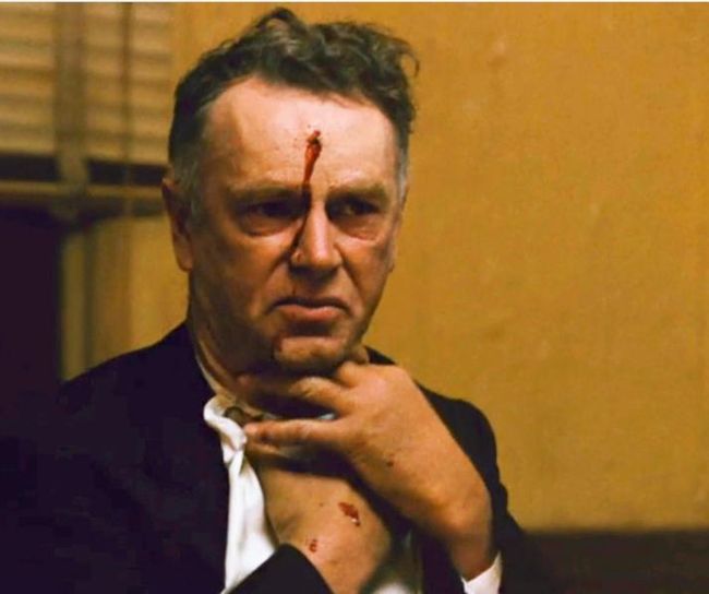 McCluskey, mid-bite, looks on in horror. Then Michael shoots him in the throat. McCluskey gargles and grabs his throat. Michael shoots him once more, also between the eyes. McCluskey wrestles for a second with the notion of being dead, and then pitches forward onto the table, sending it crashing to the ground.