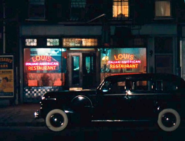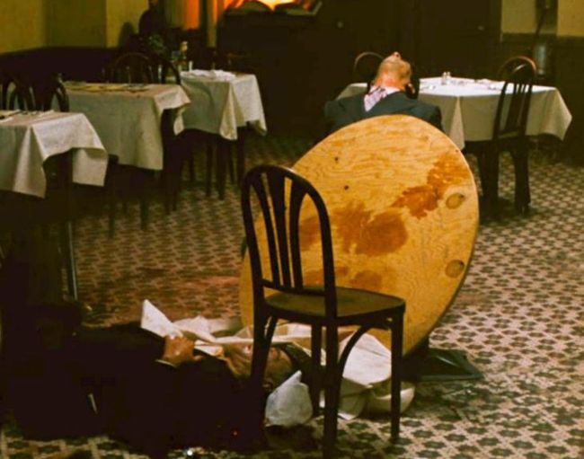 The sound of a passing train can be heard loud on the soundtrack. As it fades away, Michael walks back into the restaurant, where Sollozzo (Al Lettieri) and McCluskey (Sterling Hayden) are still sitting at the table, eating.