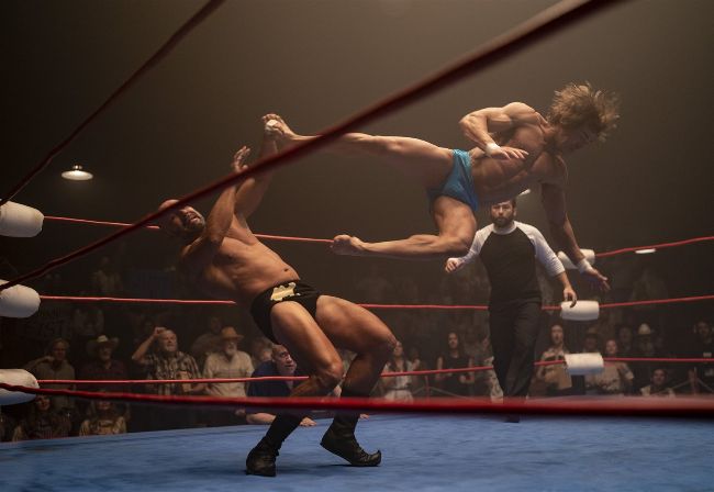 Kevin Von Erich (Zac Efron, mid-flight) in the ring.