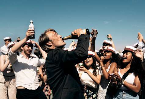 Director Thomas Vinterberg with Mads Mikkelsen on location. Right: Down the hatch! Middle-aged teacher Martin (Mikkelsen) gets the party started in style.