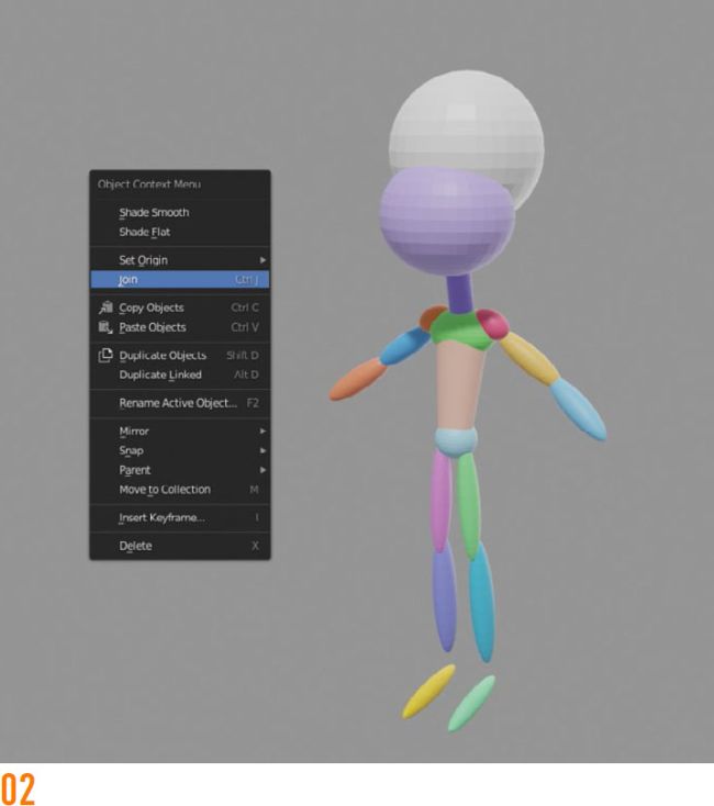 At this point the scene must have a lot of objects lying around on the outliner. You can start joining them together. Join them in six groups: head, hair, torso, arms, hands and legs. Use Ctrl+J or go to the Object menu>Join. Apply all transforms (Ctrl+A) - this will help brush deformation while sculpting.