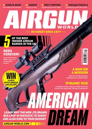 The September 2025 issue of Airgun World offers a rich mix of personal stories, expert reviews, shooting culture and even a riflescope giveaway! Guest editor David Walter shares his inspirational journey in airgunning, driven by red squirrel conservation. Reviews include the JTS Brawn bullpup for value-conscious shooters, WÜLF riflescopes for affordable clarity and the innovative Anics Skif A-3000 CO₂ pistol. We explore the artistry of DB Gunstocks UK, Florida’s fight against invasive iguanas, and pick our top five indoor airgun ranges. Bill Harriman examines the potential deregulation of sound moderators, while Pete Evans celebrates the enduring Air Arms ProSport. Mick Garvey reports the welcome return of rabbits on his permissions, and Danny Brookfield compares the classic Theoben Rapid Mk1 with the Ben Taylor Special Edition. Elsewhere, Jon Young explores CO₂ rifle appeal, while Mark Camoccio selects a quintet of the best air rifles for FT shooting.