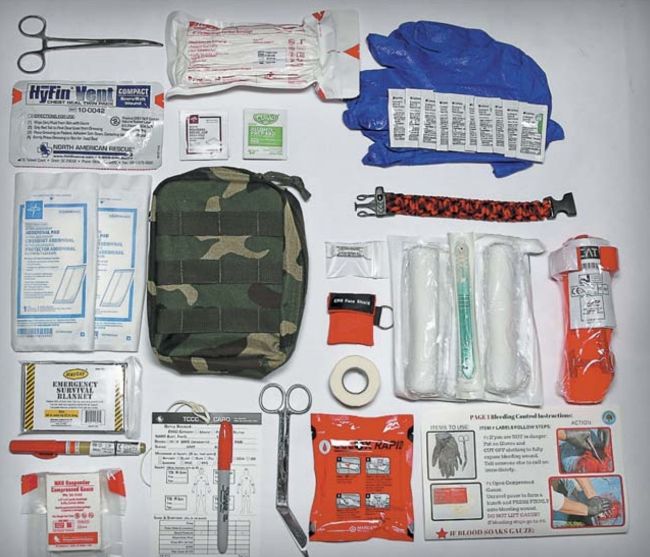 • Trauma kits treat serious burns and bleeding injuries like deep cuts, gunshot wounds, crushed limbs and broken bones. These kits include pressure bandages, tourniquets, blood-stopping bandages, chest seal and sterile saline.