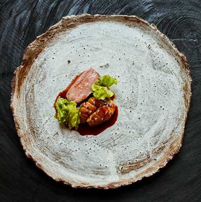 An interpretation of quail à la chasseur. Classic ingredients of this preparation are combined in a modern way in this dish. A combination that simply cannot go wrong. The sophistication begins with the quail jus, built up of several layers and beautifully finished with fresh ingredients. The smoky flavour of the chestnut mushroom grilled on the konro and the potato cooked in charcoal butter add an extra dimension and intensity of umami to the dish. The tomato provides a nice, subtle acidity to complete the dish.