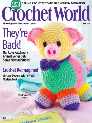 Celebrate spring by instantly downloading this must-have issue of Crochet World filled with fun, colorful crochet projects, like the darling Patchwork Pig featured on our cover! In our Colors of Spring section, you’ll find a variety of fresh floral designs for fashion and home including a gorgeous necklace, a pretty scarf and a lovely lace pillow. For your kitchen, find a cute tulip silverware pocket, a teapot hot pad and a cheerful crochet canister cozy. The projects in our Crochet Reimagined section take inspiration from vintage patterns or styles and recreate them in fresh, modern versions. Included are a stunning shawl, a cute shrug, a fashionable cloche and festive crochet pot holders. You’ll also find additional crochet patterns in this issue for fashion accessories, adorable stuffed animals for Baby and a sunny throw. Download or subscribe now for instant crochet fun!