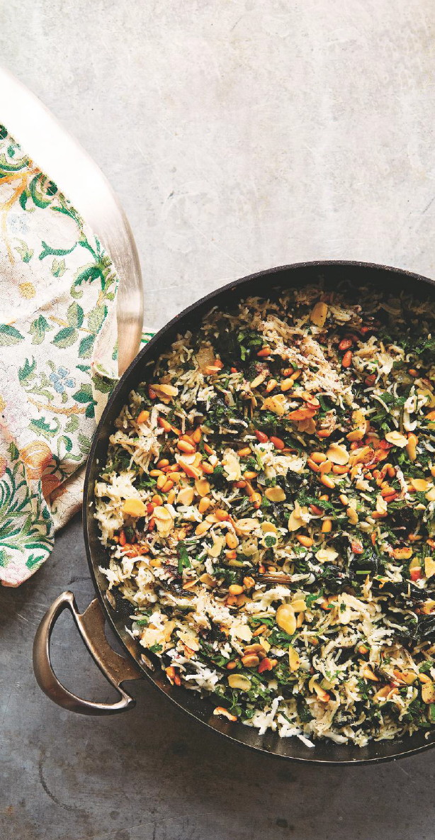 This is what’s called a pilaf/pilav/plov from the Persian word pulao, which can simply refer to a decorative rice dish. But more often, as here, it denotes the method of cooking: the rice is fried in butter or ghee, usually with vegetables and seasoning, then stock is added, the pan is covered and it’s left for 30 minutes or so to cook. Simpler pilafs can be accompaniments, but some are so rich and delish they’re a meal in themselves. Pilaf permutations are endless, so don’t be afraid to experiment with this recipe.