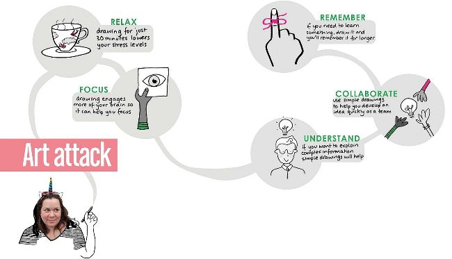 Over the last few years, she’s worked with some of the biggest brands in the world. “I’ve drawn everywhere – from scribbling in a muddy ield to doodling out of Buckingham Palace.” And now she’s agreed to show us how drawing can improve all of our day-to-day lives. So people, grab those felt tip pens…