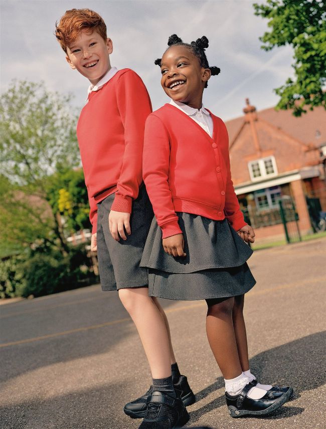 Boy’s outfit: two-pack of V-neck jumpers, from £7; two-pack of white short-sleeved slim-fit school polo shirts, from £3; two-pack of regular fit shorts, from £6; seven-pack of grey cotton-rich socks, £2.50; black mesh single-strap school shoes, from £18. Girl’s outfit: two-pack of jersey cardigans, from £6; two-pack of white girls’ pintuck school blouses, from £6; tiered skirt, from £6; five-pack of lace-top cotton-rich socks, £3.50; black rainbow Mary Jane school shoes, from £16