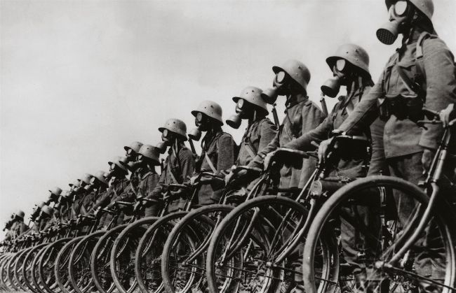 German light bicycle infantr y line up wearing gas masks in Austria. Only 18 percent of German divisions were fully mechanised by 1941, leaving their infantry highly reliant on bicycles to keep up with advances, par ticularly during the invasions of Norway and Poland. Bicycles became impor tant to the Wehrmacht once more towards the end of the war in response to fuel shor tages. On 6 October 1944, German leadership ordered all bicycles in Italy, Holland and Denmark to be confiscated to supply the Wehrmacht, a blow to the occupied nations’ agriculture and industr y as workers often had to bike to work.