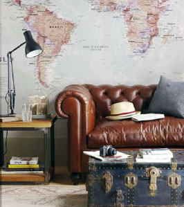 Jetsetters and salvage worshippers, listen up! Map murals are in, and we’re all over it. Wallpaper like this from Maps International looks stellar, but can cost a buck or two. Recreate the look with a collage of map scraps (you can find these in charity shops and at boot sales for a bargain), then tape your favourite snaps to the wall, close to the country they were taken in. Finish the scheme with a trunk or upturned crate coffee table and industrial-style lighting.
