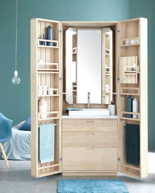 Meet ‘La Cabine’, an ultra-compact bathroom cupboard by French designers La Fonction and Line Art. It’s a fantastic way to cheat an en suite for spare bedrooms (minus the toilet), and it could easily be done on the cheap by building a sink unit into an MDF frame and adding hinged storage doors.