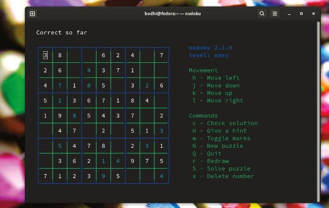 N udoku is a ncurses-based Sudoku game, which challenges you to place numbers one to nine within grids of various sizes. You’ll find it in the official repos of most distros and most users can install it with either sudo apt install nudoku on Ubuntu or sudo dnf install nudoku on Fedora.