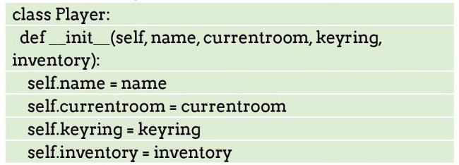 This would work for the INVENTORY command, in that it would list all these items one at a time, but it’s a bit thin on detail. Part of the fun of text adventures is knowing which items to pick up and use to interact with your environment. This is why it’s best to create a new Item class at the top of your script: