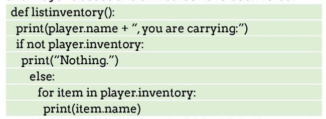 This function is simple in that it just lists the player’s name, then goes through their inventory listing items. Players can invoke it any time by typing INVENTORY . This is part of the revised action_input that allows you to do more than just explore rooms (more on this later).