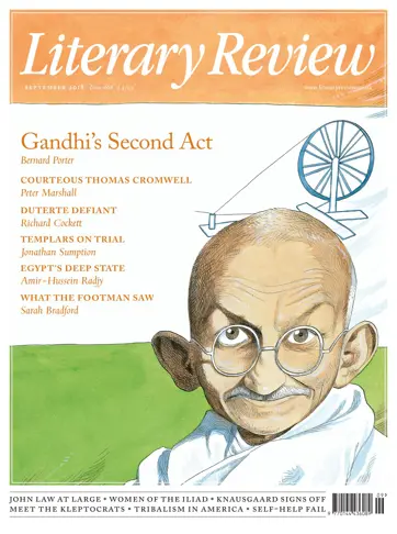 Bernard Porter on Gandhi's later years * Jonathan Sumption on the templars * Carol Rumens on Elizabeth Jennings * Jill Rutter on British PMs' relationships with Europe * Peter Marshall on Thomas Cromwell * John Lloyd on Alan Rusbridger * Joan Smith on women's pain * Nicholas Vincent on Henry II * Richard Cockett on Rodrigo Duterte * David Gelber on Brazil * Daisy Dunn on labyrinths * D J Taylor on William Boyd * Edith Hall on Pat Barker * Alan Ryan on emotions in politics * Sarah Ditum on self-help failures *