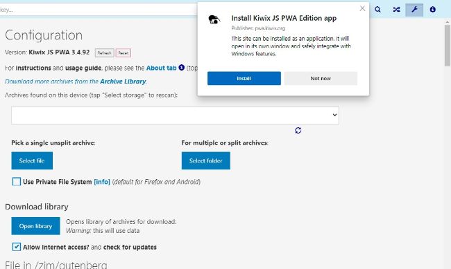 » According to the developers, you’ll get the best performance from ‘native’ versions of Kiwix like this. However, you can also install Kiwix JS. This is written entirely in JavaScript, so is compatible with virtually every web browser. It’s available as a browser extension for Edge, Chrome, and Firefox. [Image A]