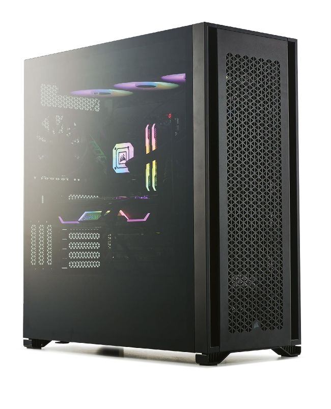 WE’VE ALREADY MENTIONED the case and cooler, but let’s get into details. The Corsair 7000D Airflow is a gigantic construction of steel and tempered glass that offers everything from EATX support to numerous drive mounts, with triangular perforation on the top, front, and right-hand panels to ensure superior airflow from any of the four radiator mounts. Meanwhile, the iCUE H170i Elite Capellix AIO cooler offers supposedly top-tier CPU cooling with 57 addressable RGB LEDs (33 on the pump block, and eight per 140mm fan) to ensure your PC looks fly as heck.