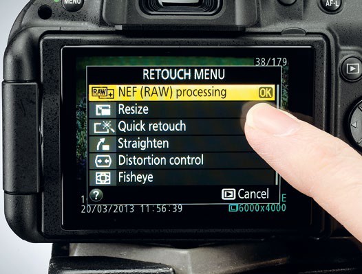 The NEF (Raw) processing option is at the top of the Retouch menu. Press OK, then select the image that you would like to edit, and press OK again.