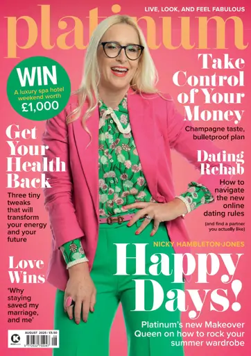 New look Platinum! Welcome our new Editor-in-Chief Suzy Walker – she talks to cover star Nicky Hambleton-Jones about reinvention * Seasonal style, reader makeover and the perfect summer co-ord * Your time to thrive with advice on health, wellbeing, relationships and money * How to save a marriage * Ideas for great interiors * Great British staycation inspiration * Plus all your favourites: puzzles, recipes, fiction and more * WIN! A stay in the New Forest, worth £1,000!