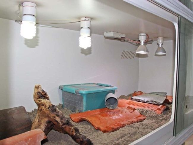 Kamiel uses different types of set-up. This is a vivarium intended for a single egg-laying female, with the egg box and entrance clearly visible here in the centre.