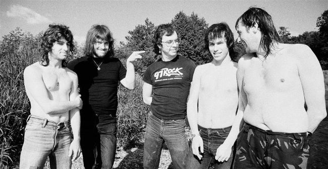 Marillion (L-R): Pete Trewavas, Steve Rothery, Andy Ward, Mark Kelly and Fish in 1983.